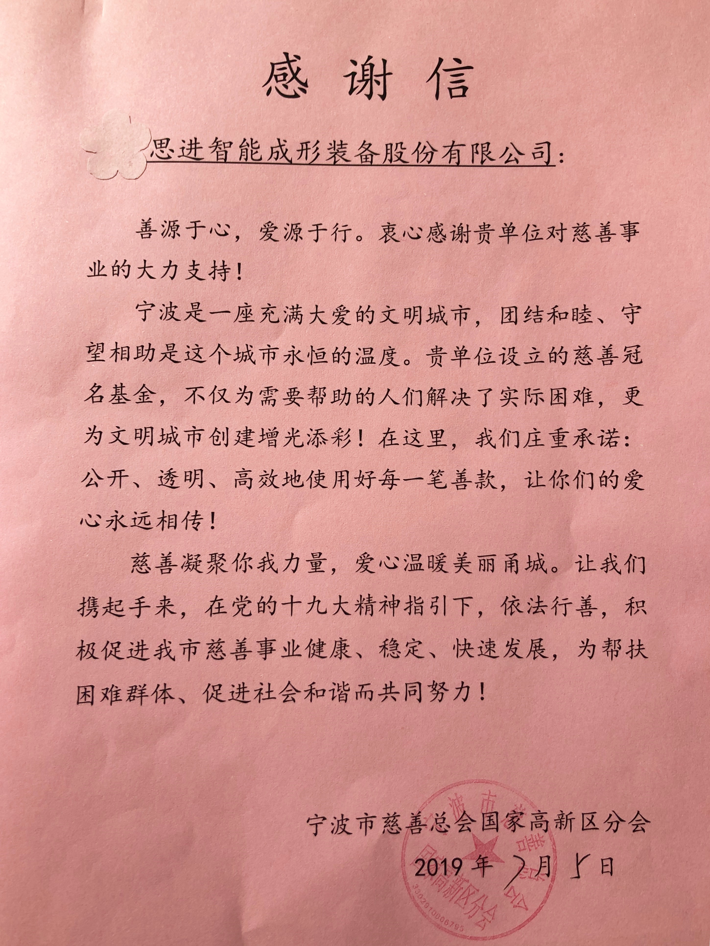 思進(jìn)智能成形裝備股份有限公司是一家致力于提升我國冷鐓成形裝備技術(shù)水平、推動(dòng)冷鐓成形工藝發(fā)展進(jìn)步、實(shí)現(xiàn)緊固件及異形件產(chǎn)業(yè)升級(jí)的國家級(jí)高新技術(shù)企業(yè),積極營造優(yōu)質(zhì)和諧的企業(yè)文化。思進(jìn)智能設(shè)立的100萬元公益慈善基金,甘為播種機(jī),把公益慈善的種子播撒在更多人的心田。不僅為有需要的人帶去了慰問,更弘揚(yáng)了企業(yè)的慈善文化。